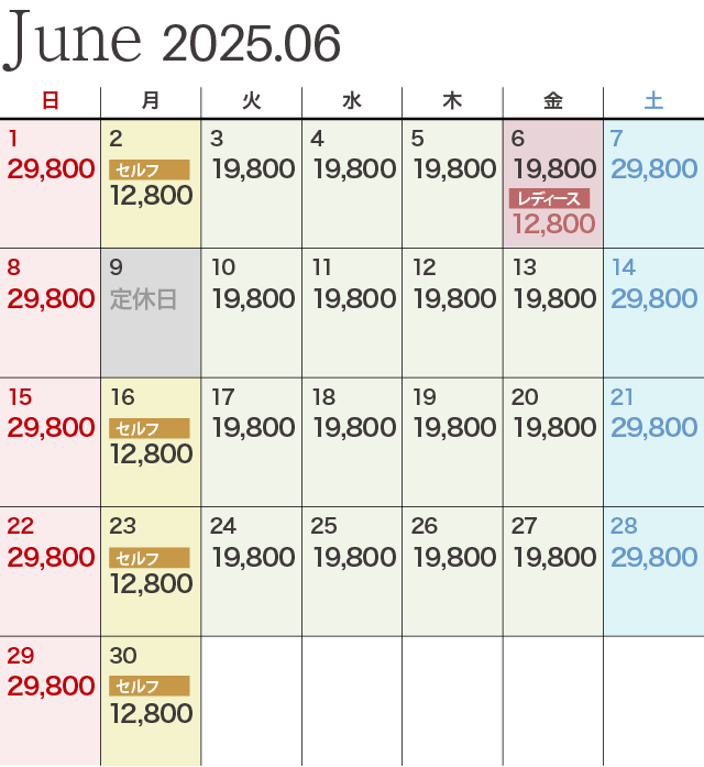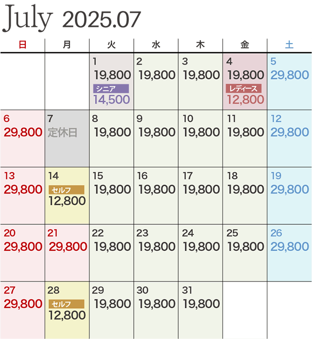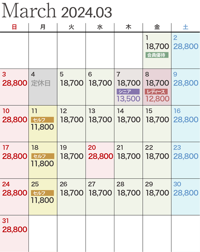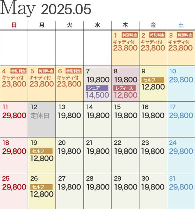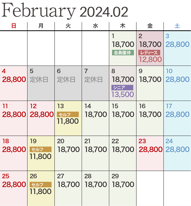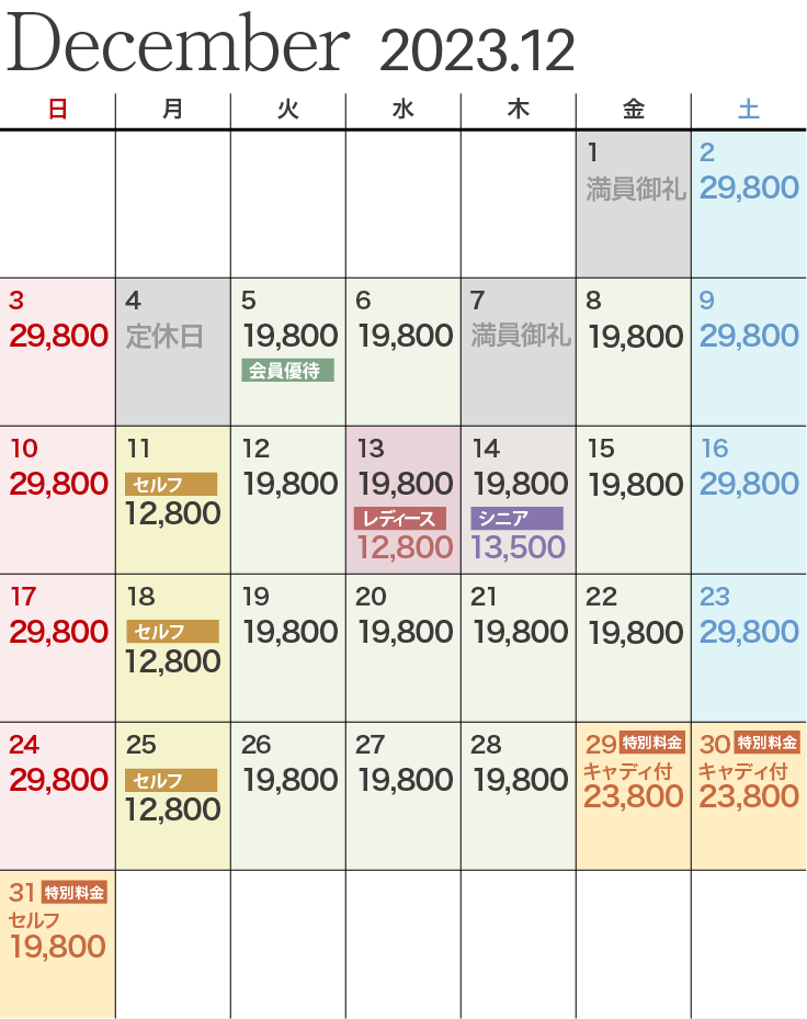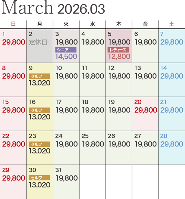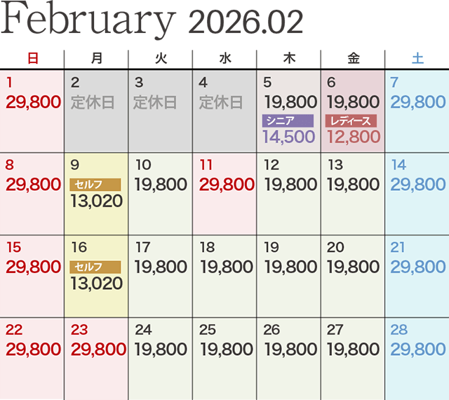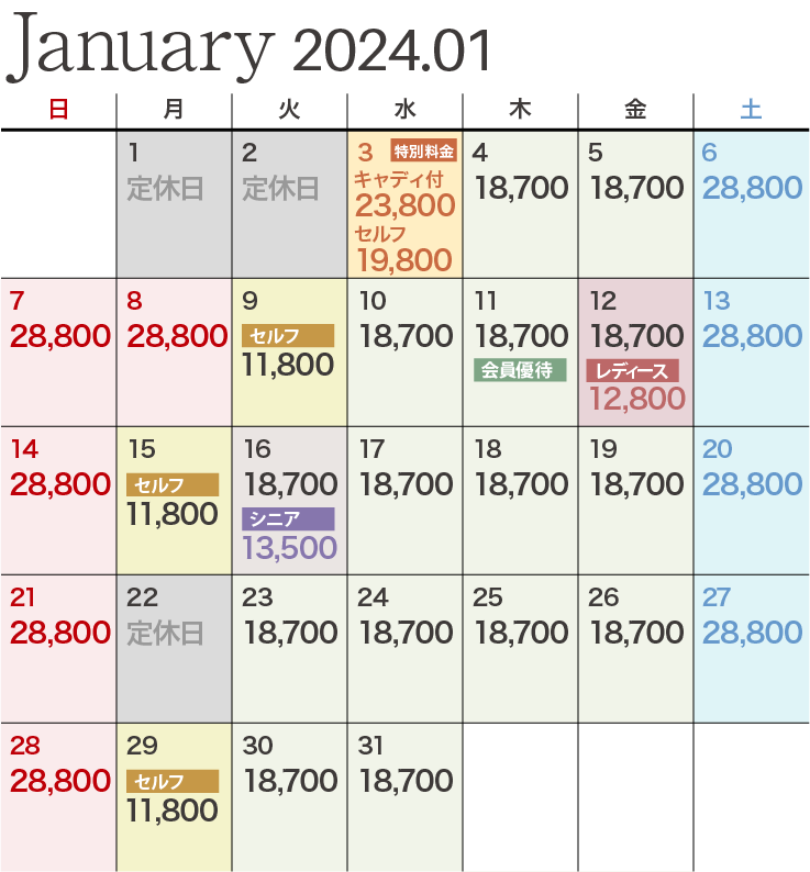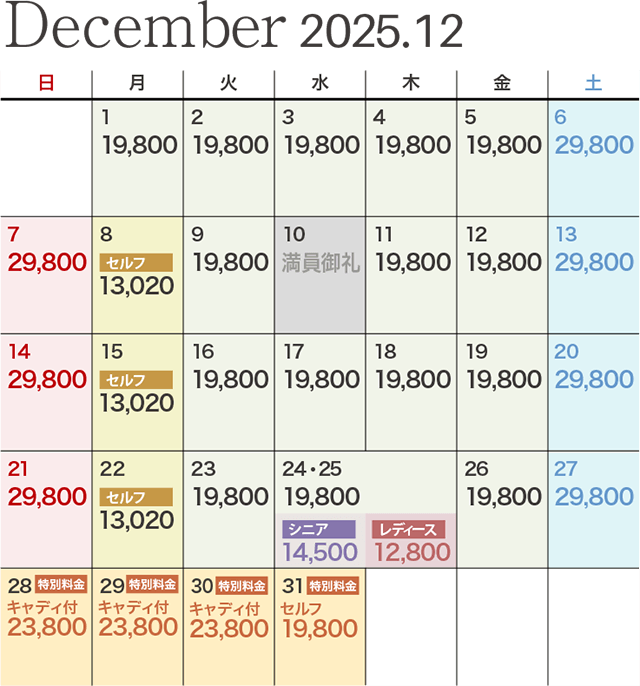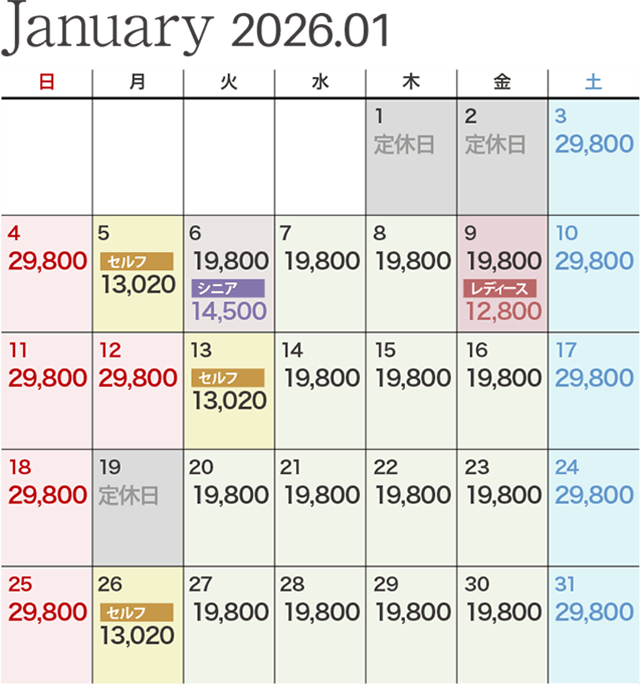 | レディース優待デー | ビジター価格 12,800円 ※セルフプレーの場合は1,650円引きとなります。 |