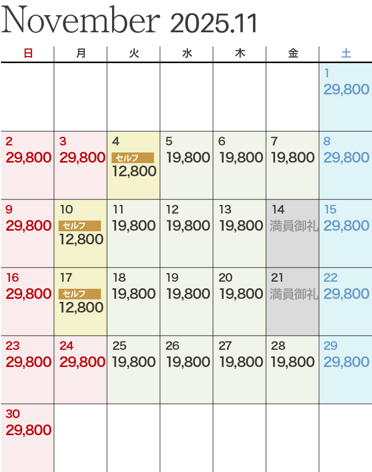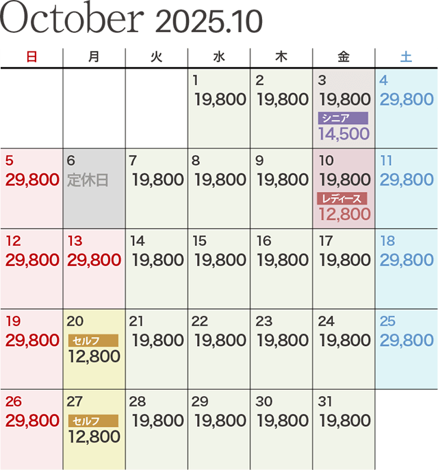 | セルフデー | 10月~11月度 12,800円 12月度~ 13,020円 |