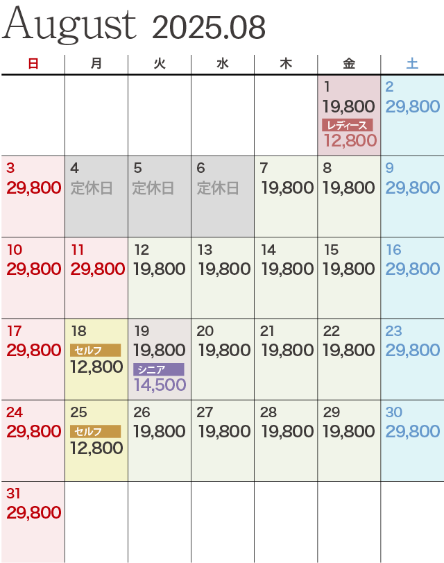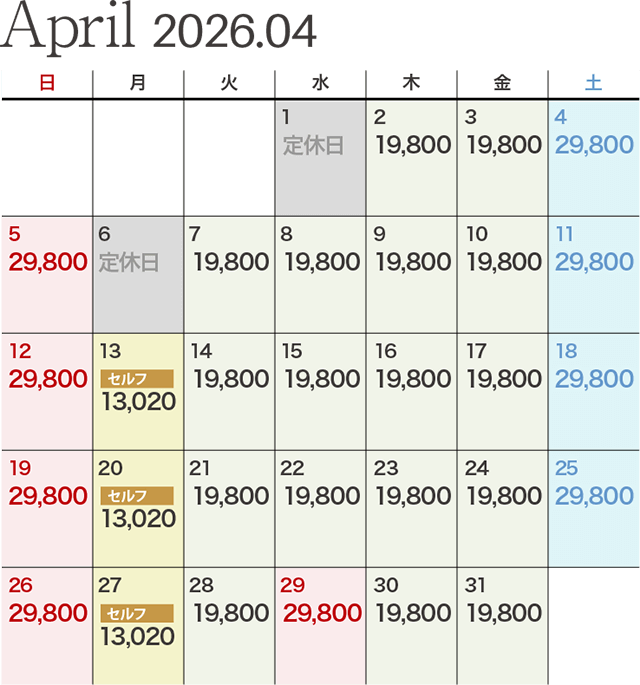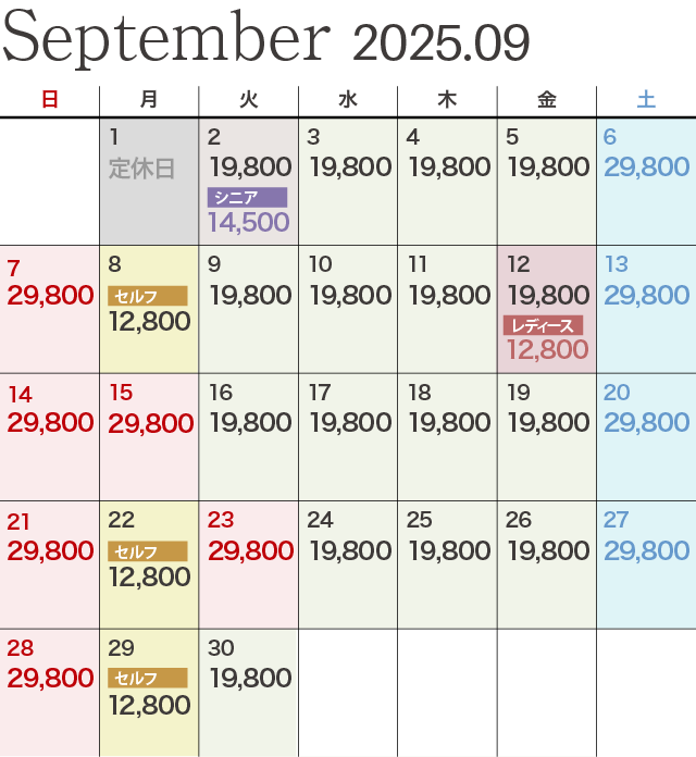 - セルフプレーの場合は、表記金額から2,750円引きとなります。(セルフデー除く)