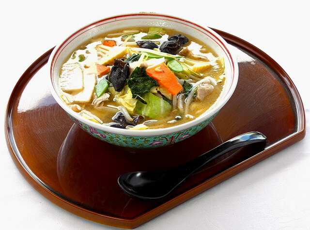 柔らかい豆冨の食感、アサリの出汁に秘伝の隠し味を効かせた辛口スープに、生卵のコクが欠かせない自慢の一品です。