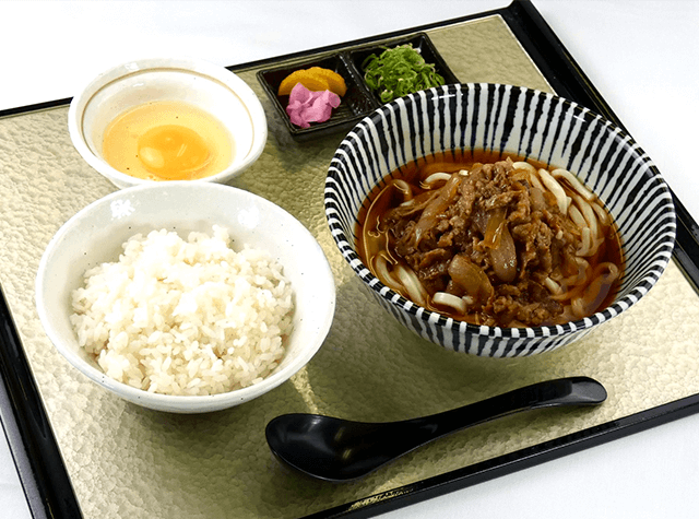 味付けしっかりのお肉をうどんと供に。また、お肉は途中で、溶き玉子につけて御飯と供にお召し上がり下さい。